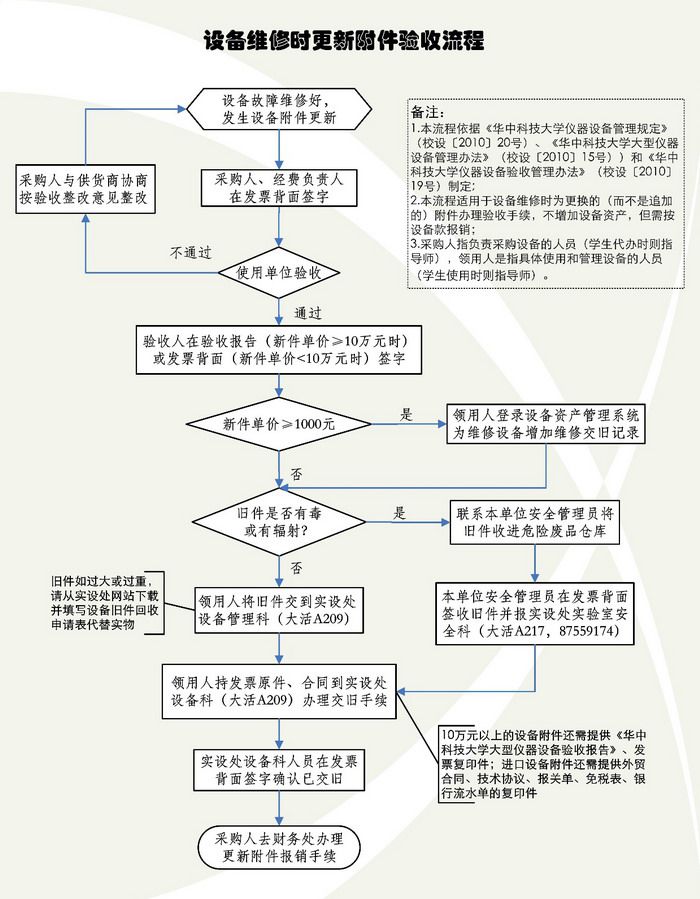二、验收 (一)单价10万元以下的仪器设备,由使用单位组织2名以上在编在册教职工验收。验收合格的,参与验收人员均应在发票或发票所附货物清单签名,使用单位设备管理员随后审核签名。 (二)单价10万元(含)以上大型仪器设备,使用单位应组织专家组验收,验收专家组应由3人(含)以上的单数组成。其中申购单价40万元(含)-100万元的仪器设备,验收专家应至少有1名非本单位并熟悉拟购仪器设备的技术专家。对于单价100万元(含)以上的,验收专家组应由5人(含)以上的单数组成(其中至少应有2名非本单位并熟悉该仪器设备的技术专家),并通知负责该设备申购论证的职能部门派观察员参加验收会。验收通过的,由使用单位填写大型仪器设备验收报告,经验收专家签名、使用单位设备管理员和使用单位仪器设备分管领导审核签名,加盖使用单位公章,报实验室与设备管理处审核存档。 (三)进口仪器设备的验收,要严格按照国家海关关于进口设备的有关规定,在索赔期(自货到港口之日起90天内)完成。验收中如发现仪器设备外包装与合同不符,数量、质量及技术指标未达标及货物损坏等情况,应及时提出索赔,并向实验室与设备管理处书面备案。 三、建账 单价在1000元(含)以上的仪器设备经验收合格,需办理仪器设备建账手续。具体程序为: (1)领用人或设备管理员在设备管理系统中提交仪器设备建账申请; (2)设备管理员在设备管理系统中初步审核; (3)有关人员持发票及购货合同,或自制仪器设备研制费用清单及相关凭证复印件,或捐赠合同,到实验室与设备管理处办理终审手续;对于大型仪器设备,还需同时提交大型仪器设备验收报告; (4)实验室与设备管理处对相关资料进行审验,核发仪器设备验收凭证及仪器设备标签。 仪器设备验收凭证是办理财务报销的依据,不得遗失;如有遗失需提出书面申请方可补发。仪器设备标签是设备清查的依据,领用人应将其妥善粘贴于仪器设备表面。 科研项目中为校外单位代购(代制)的仪器设备,不在校内办理仪器设备验收和建账手续;科研项目承担单位凭科研项目合同、仪器设备采购合同、发票、校外单位接收仪器设备证明,经本单位经济责任人审批后,到财务部门办理报账手续。 自制且归学校所有的仪器设备,项目承担单位办理仪器设备验收和建账手续后,方可进行项目结题验收。 新购设备建账流程 自制仪器设备建账流程 四、仪器设备的价格变更、退库 (一)发生下列情况的,由仪器设备使用单位提出申请,附上必要证明材料,经实验室与设备管理处审核确认后,可以变动仪器设备价值: 1.根据国家规定对仪器设备重新估价的,根据实际价值调整原来暂估价值的,或发现原来记录仪器设备价值有误的。 2.对仪器设备改装、增加零配件或扩充功能的。其中,对仪器设备增加零配件或扩充功能的,按仪器设备附件增值计价入账;在原有仪器设备基础上改装,按改装发生的支出,减去改装过程中发生的变价收入后的净增加值,变动仪器设备账。 经批准变动仪器设备价值的,由仪器设备使用单位及时通知财务部门。 (二)已验收建账的仪器设备因故需要退货并销账的,由领用人提出书面申请,经使用单位分管领导审批签字并加盖单位公章,报实验室与设备管理处审核后办理仪器设备下账手续。其中已办完财务报销手续的,必须提供财务部门退款收讫证明;尚未办理财务报销手续的,必须返还仪器设备验收凭证。 五、以旧换新 对仪器设备的零配件维修更新,办理以旧换新手续,不增加仪器设备原值。仪器设备以旧换新更换零配件按以下程序办理: 1、使用单位对用于更新的零配件进行验收。单价5000元以下或批量价格20000元以下的,由2名(含)以上在编在册教职工验收;单价5000元(含)以上或批量价格20000元(含)以上零配件更新,使用单位设备管理员必须参与验收。验收合格后,参与验收人员在发票(或发票所附货物清单)签名; 2、设备领用人登录设备管理系统对设备的零配件更新作以旧换新登记; 3、使用单位派人持购货合同、发票和换下的旧零配件到实验室与设备管理处办理终审手续;对于过大、过重或有毒性、放射性的旧零配件,则填写《设备旧件回收申请表》代替实物,由实验室与设备管理处负责回收处置。需要使用旧件折抵新件货款的,由使用单位审核,并附相关合同,经实验室与设备管理处批准,可免交旧件。 维修交旧流程图 六、调剂调拨 校内各使用单位之间进行仪器设备调剂(或划转),必须符合设备管理相关规定并保证账随物走,及时按以下程序办理调剂(或划转)手续: 1、调出单位设备管理员在设备管理系统中提交设备调剂(或划转)申请; 2、调入单位设备管理员在设备管理系统中同意接收调剂(或划转)的仪器设备; 3、调出单位设备管理员在设备管理系统中打印仪器设备调剂(或划转)申请表; 4、调出单位主管领导审核签字; 5、调入单位主管领导审核签字; 6、双方移交仪器设备; 7、调出单位将调剂(或划转)申请表送实验室与设备管理处设备管理科办理转账手续。 离退休、离职、调动或长期(1年以上)出国人员,应在离岗前经单位设备管理员办理仪器设备移交手续后,方可办理相关手续,不得拒绝移交或私自处理(带走、转送、变卖等)仪器设备。使用单位应及时落实新的领用人,并由设备管理员在设备管理系统修改领用人和存放地点信息。 七、仪器设备处