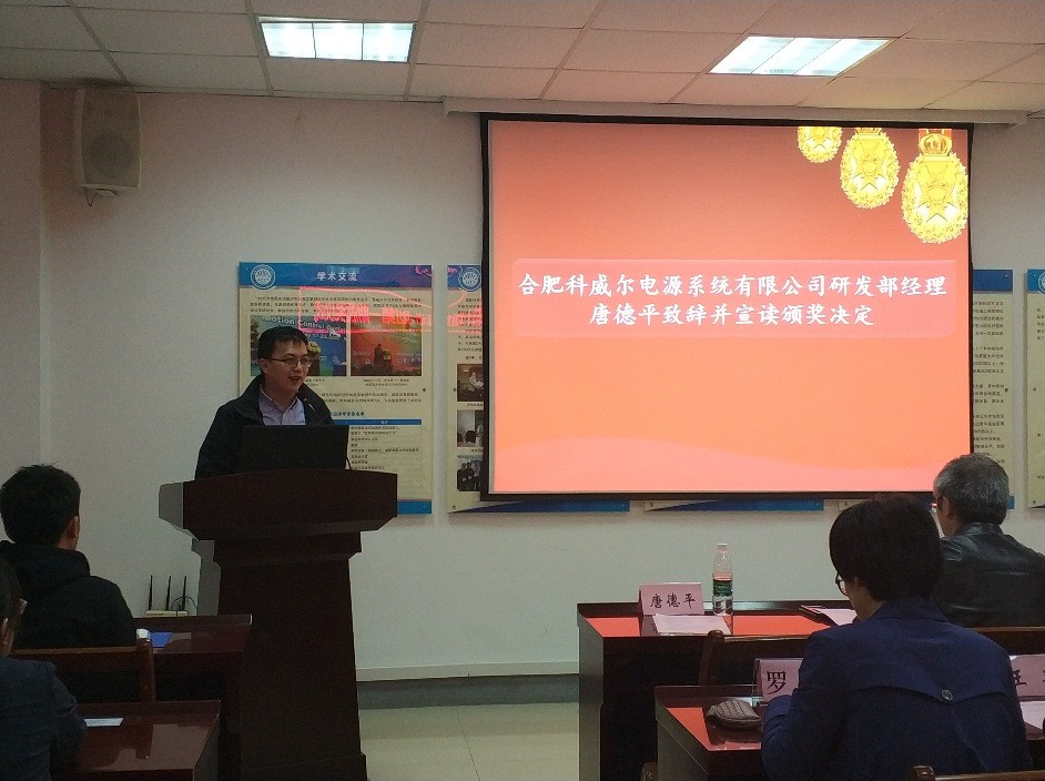 唐德平致辞并宣读颁奖决定。合肥科威尔电源系统有限公司是一家从事于交直流电源和仪器开发的科技创新型公司,希望通过设立助学金,培养并吸收更多的创新型人才,希望同学们再接再厉,学习更上一层楼。
