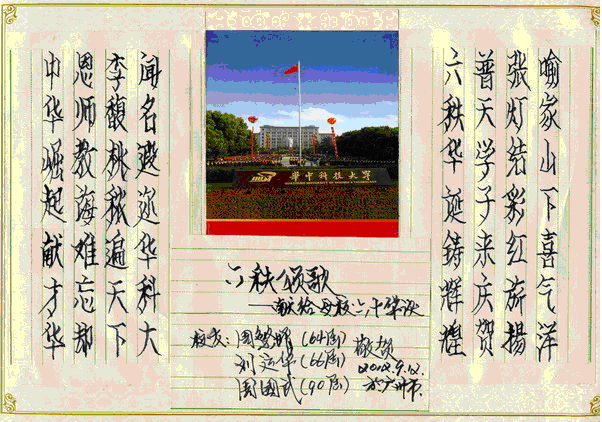 2012年9月12日,电气学院64届校友周繁增、66届校友刘运华和90届校友周国武共同作诗献给母校六十华诞: